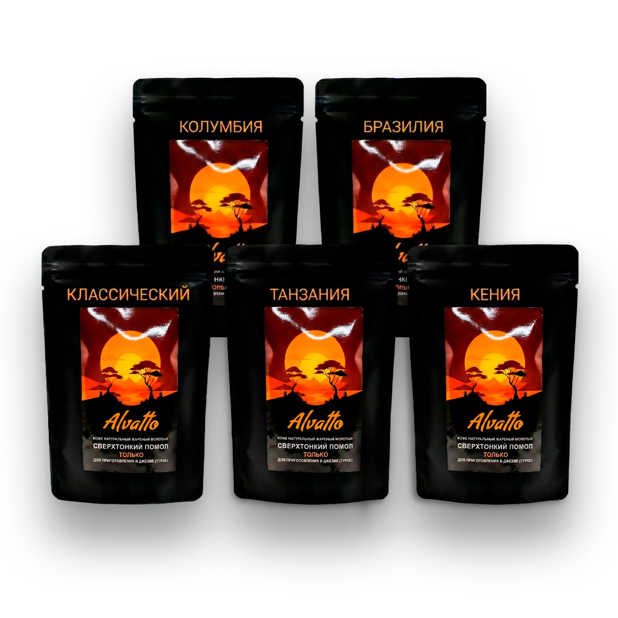 Готовый набор для кофейной дегустации дома. Внутри — пять популярных сортов со всего мира в удобных пакетах по 100 г. Этот набор включает пять известных кофейных регионов: универсальную Классику (купаж), а также моносорта из Колумбии, Бразилии, Танзании и Кении. Сверхтонкий помол создан специально для традиционного приготовления — он идеально подходит для варки в турке (джезве) или простого заваривания прямо в чашке. Такой помол гарантирует максимально насыщенный, мощный вкус и густой аромат. Сравните, почувствуйте разницу и выберите тот самый сорт, который придётся вам по душе.