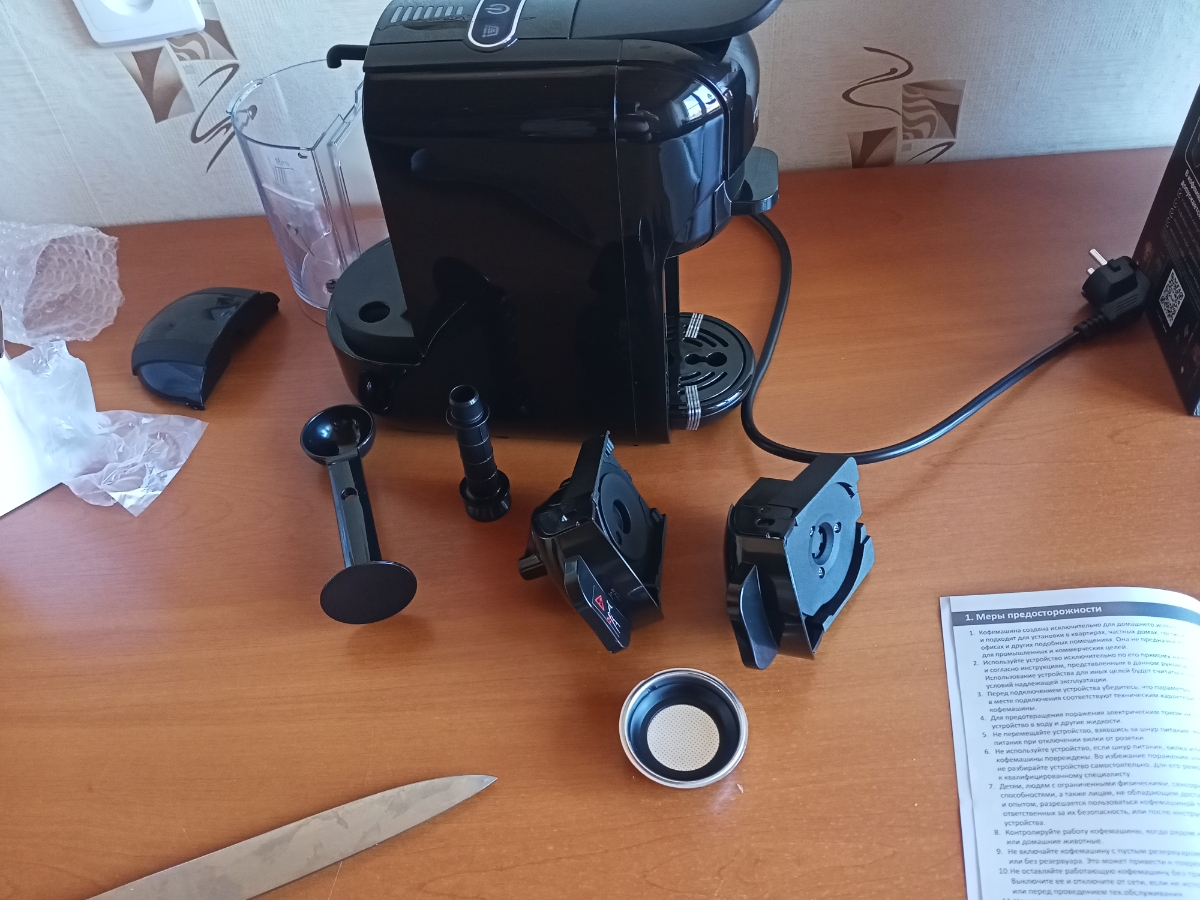 | Комплектация | Кофемашина - 1шт., Резервуар для воды с крышкой - 1 шт., Адаптер для молотого кофе и чалд (кофе в фильтр-пакетах) - 1 шт., Адаптер для капсул Nespresso - 1 шт., Адаптер для капсул Dolce Gusto - 1 шт., Мерная ложка - 1 шт., Трубка с толкателем - 1 шт., Инструкция на русском языке |