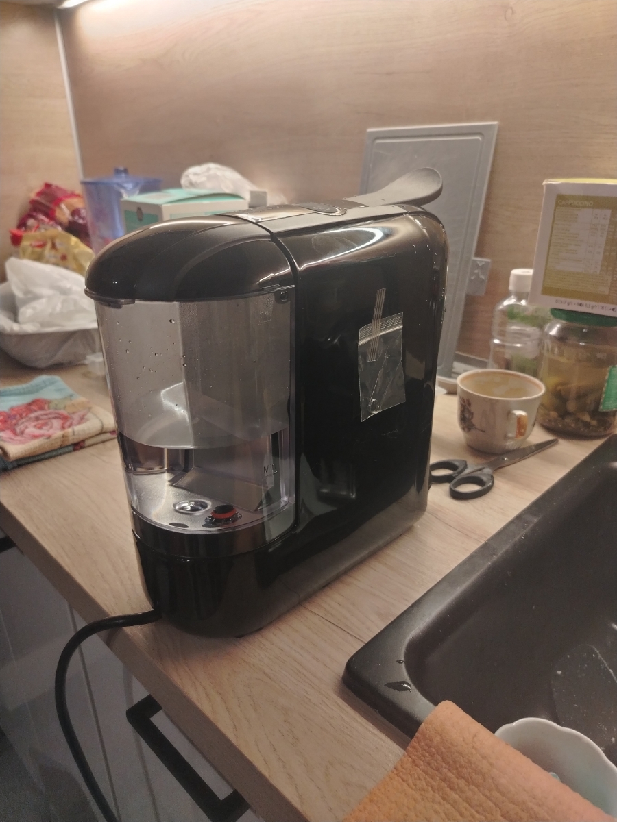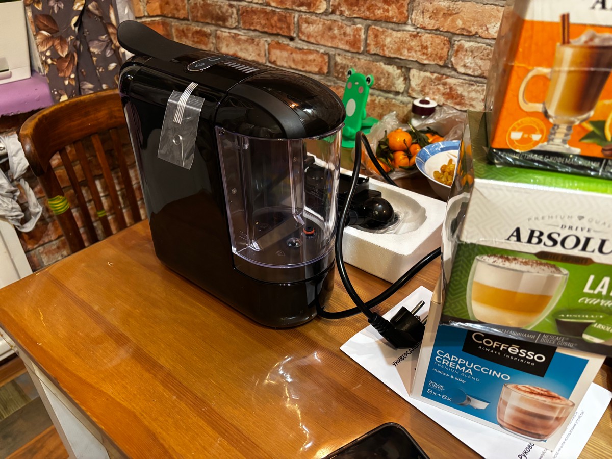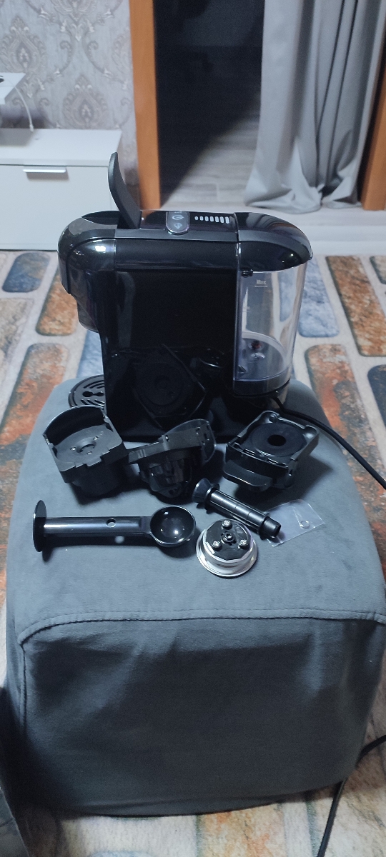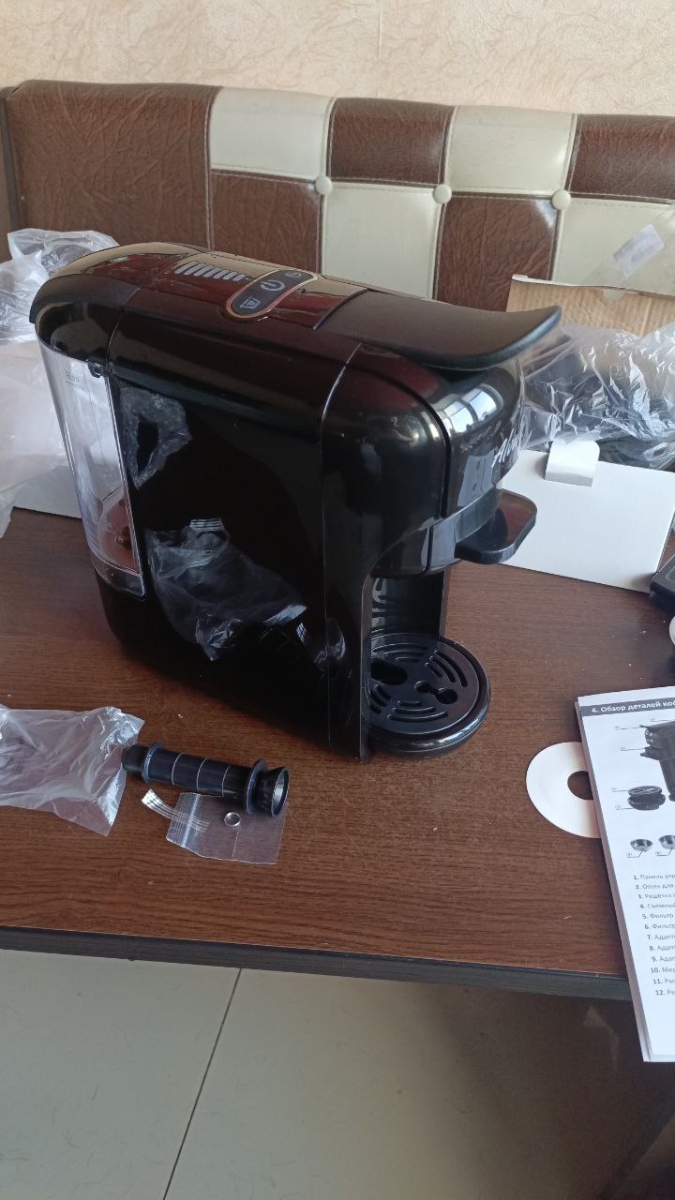 Всё необходимое уже в коробке: кофемашина, 3 сменных адаптера (для формата Неспрессо, Дольче Густо и молотого кофе/чалд), мерная ложка-темпер и специальная помпа-шприц для легкого первого запуска и прокачки системы. Съемный бак и поддон для капель легко моются.