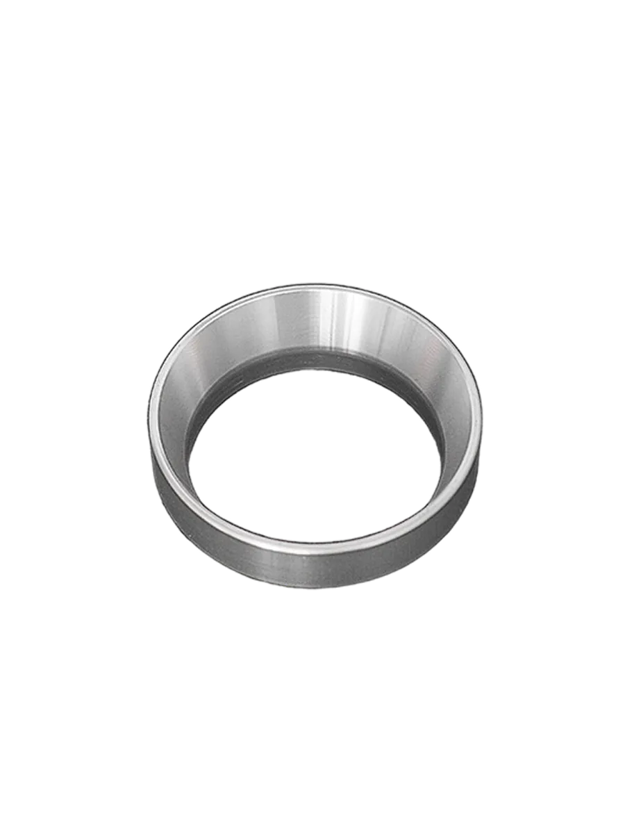Воронка (трихтер) изготовлена из алюминия с защитным анодированным серебристым покрытием, что обеспечивает долговечность и аккуратный вид. Стенка имеет классическую конусную форму, а в нижней части предусмотрен бортик, который изготавливается под размер портафильтра, гарантируя идеальное центрирование воронки.
