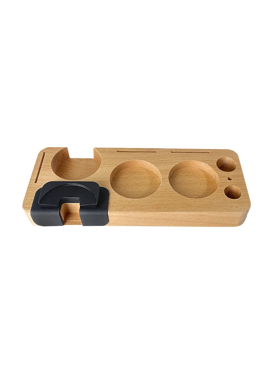 Органайзер для кофейных аксессуаров от Alvatto — прочный и стильный деревянный аксессуар, созданный для удобного хранения темперов, дистрибьюторов, портафильтров и других инструментов диаметром 51-58 мм. Гладкая полировка и высокая плотность дерева обеспечивают долговечность, предотвращая трещины и деформации. Внизу установленны четыре силиконовые противоскользящие подушечки, которые защищают стол и кофейную станцию, уменьшают износ аксессуаров и предотвращают скольжение при использовании. Органайзер Alvatto имеет функциональный дизайн «9 в 1» с большим пространством для хранения, благодаря чему все необходимые кофейные принадлежности всегда под рукой, позволяя быстро и удобно готовить кофе. Универсальная конструкция подходит как для домашнего бариста, так и для профессиональных кофейных заведений, обеспечивая порядок и комфорт во время работы.
