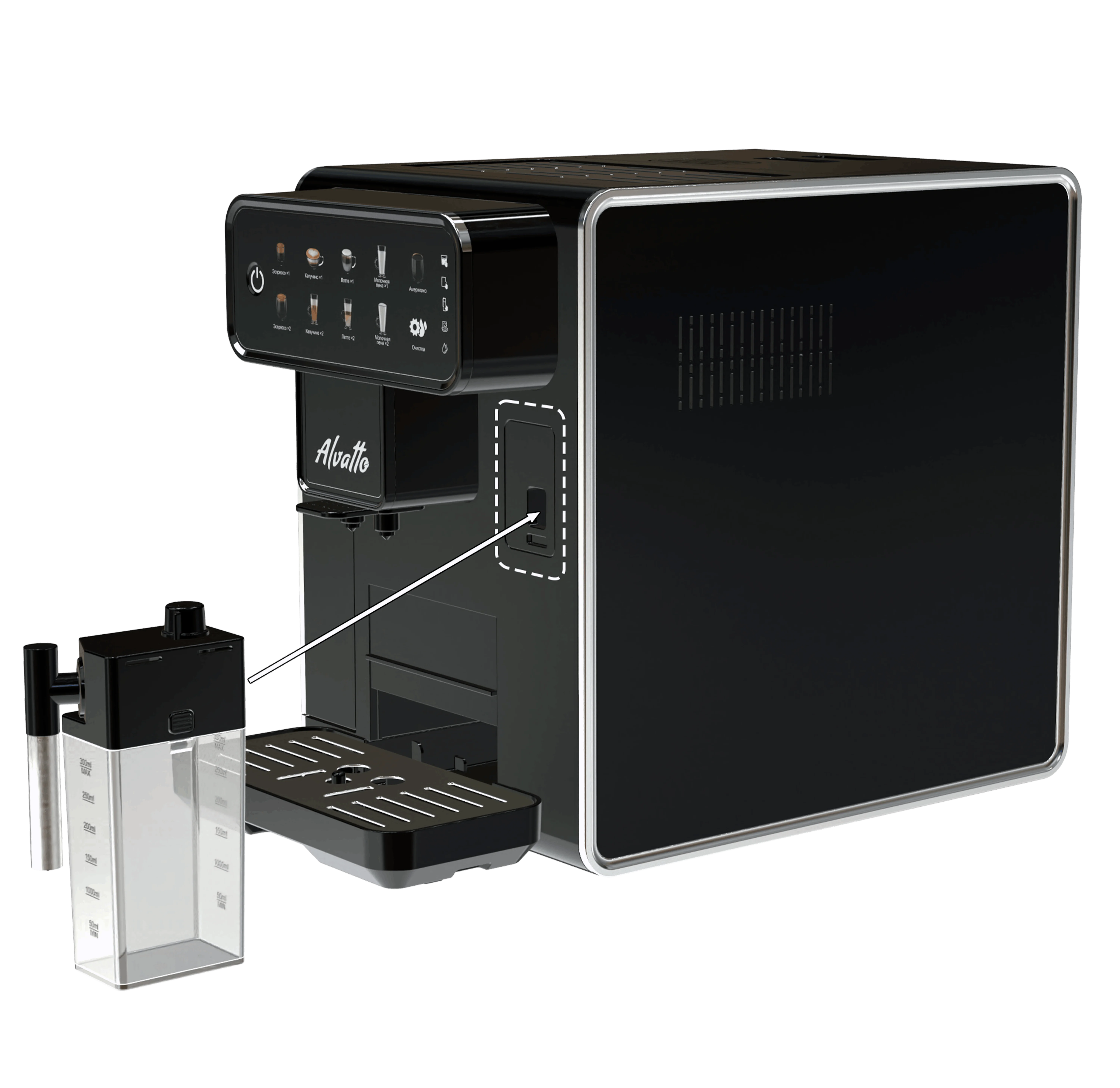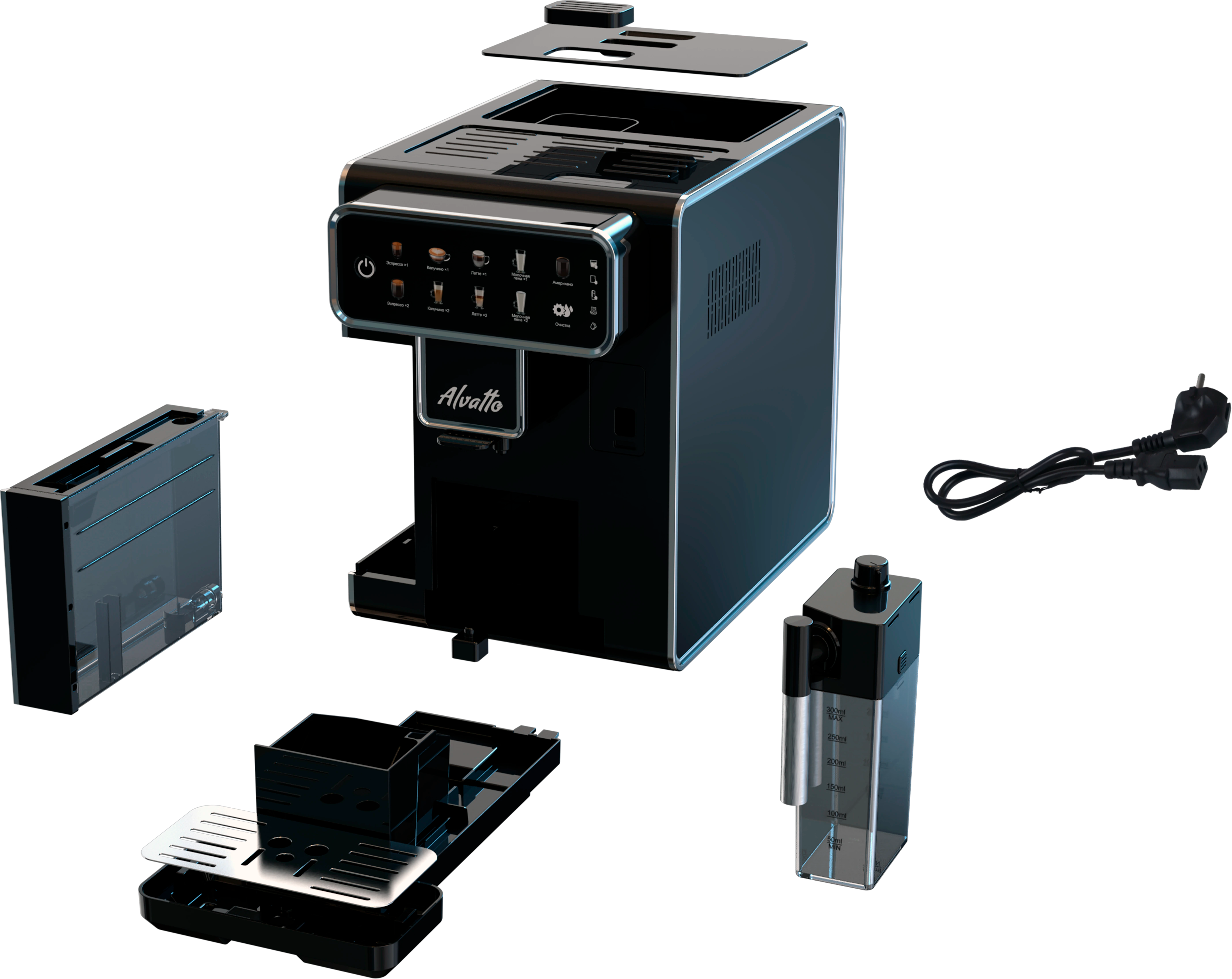 Кофемашина Alvatto Vivo, емкость для молока с трубкой, кабель питания, инструкция по эксплуатации на русском языке.