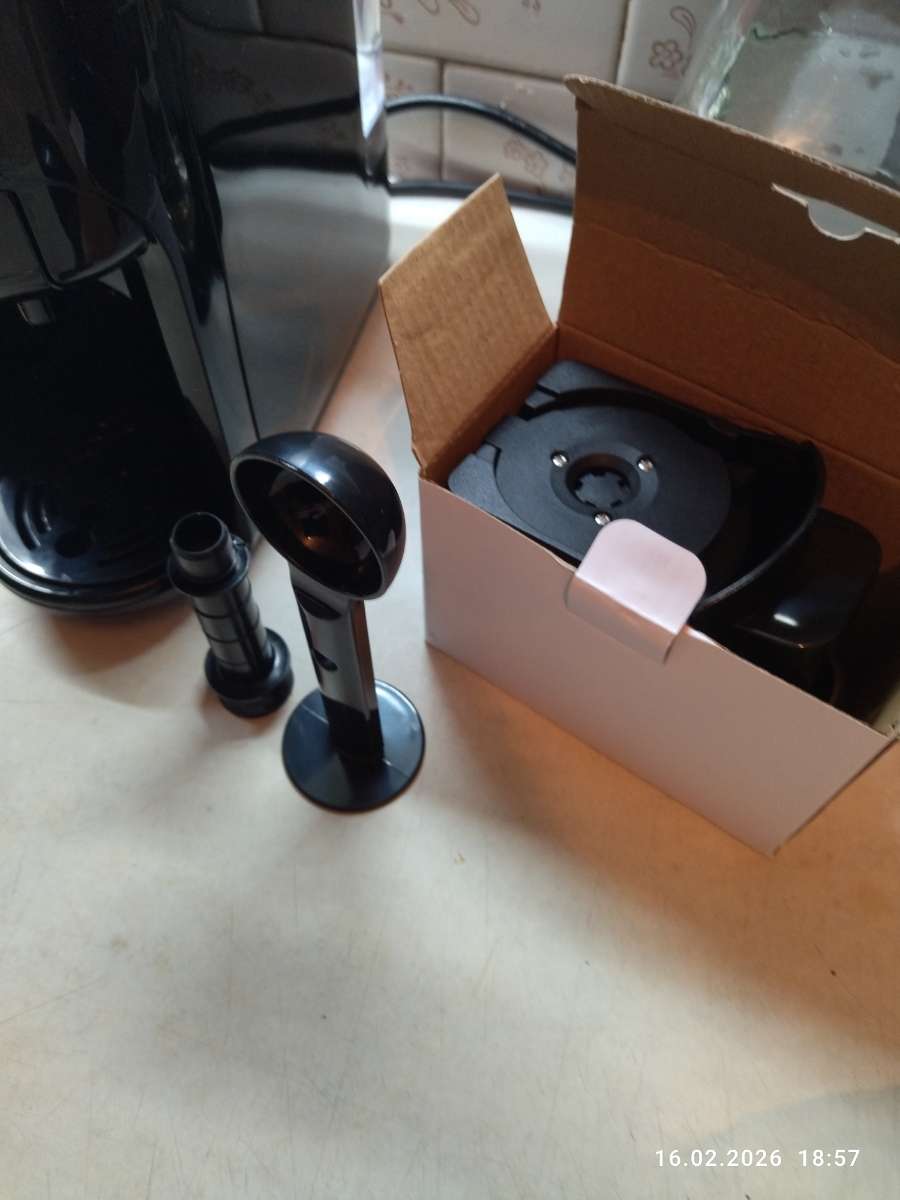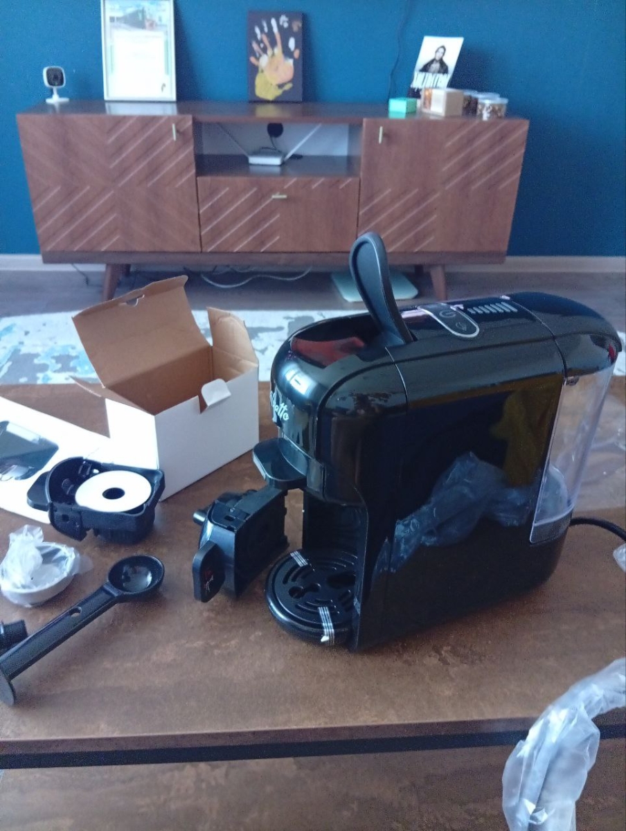 Всё необходимое уже в коробке: кофемашина, 3 сменных адаптера (для формата Неспрессо, Дольче Густо и молотого кофе/чалд), мерная ложка-темпер и специальная помпа-шприц для легкого первого запуска и прокачки системы. Съемный бак и поддон для капель легко моются.